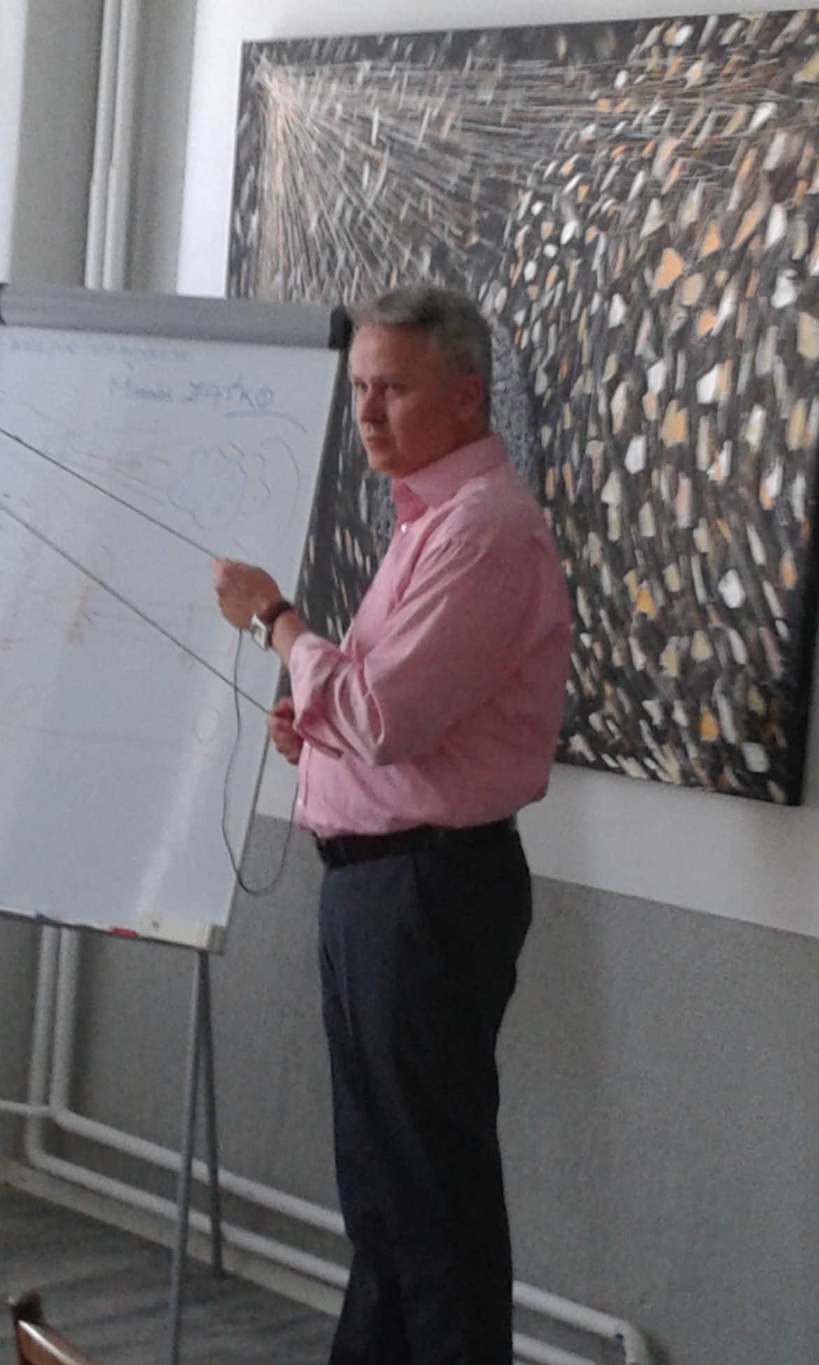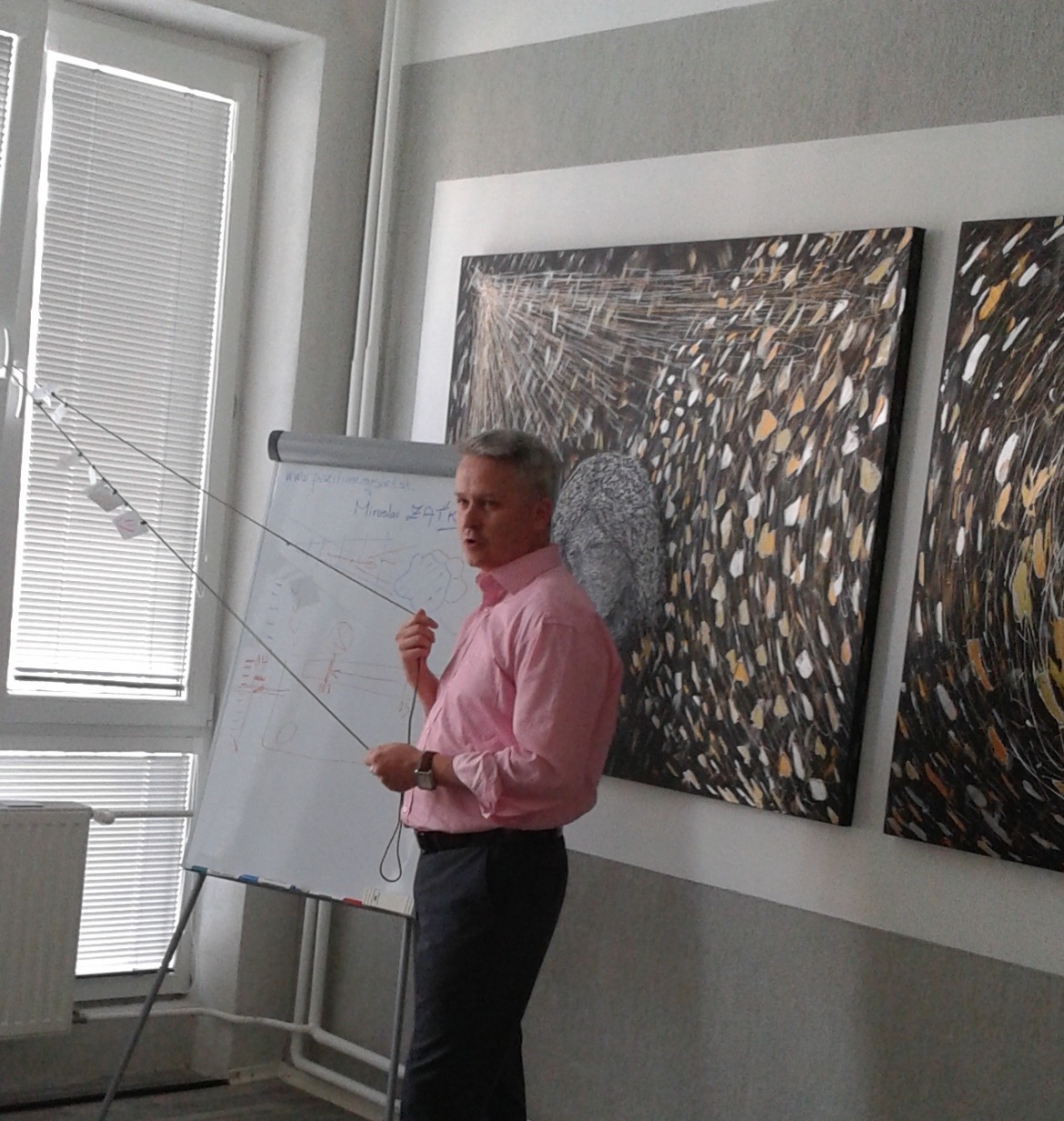 Foto z prednášky Miroslava Zaťka . Autor knihy Je ľahké spraviť zvislú čiarku nám ukázal ako urobil svoju životnú zmenu.
